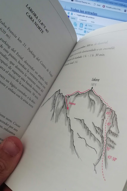 Propuesta de Patricia Viscarret y Alberto Urtasun en la vertiente norte del monte Lakora en forma de pequeño corredor, y que aparece en su guía de 2008 sobre Belagua y alrededores. A las ocho y media salgo rápido de Erraitze, sorprendido de lo que calienta el sol para esta hora de la mañana. En cincuenta minutos de aproximación rodeo toda la vertiente este de la montaña para colocarme bajo el marcado corredor, a la derecha de una característica banda de roca, en esta ocasión adornada con churros de hielo, que miro y temo que caigan porque la temperatura es alta, además toda la base de la pared está repleta de pequeños aludes de fondo y restos de desprendimientos. Y me doy prisa.