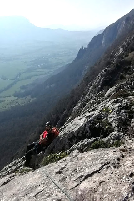 En la segunda visita de Mai al lugar decidiremos hacer una combinación de tres vías. Treparemos por la Txintxako Kalea para calentar, con la ilusión de hacerlo con el croquis hecho por Xabier Larretxea en su pedazo de blog "Escalando". La vía la abrimos Txintxa, Txibi y yo en marzo de 2022. Después entraremos en la parte superior del macizo trepando por la segunda parte de la Litos. Menudo tumbarral compacto son el largo 5 y el inicio del largo 6.... Escalada de adherencia y de grandes vistas la que abrimos Txintxa y yo en noviembre de 2020. Al final, porque los dos últimos largos de la Lur Itxoin Pittin Bat son muy bonitos, decidiremos pasarnos a esta, sumando finalmente 8 largos (3 de la Txintxako, 3 de la Litos y 2 de la Lur). A destacar la preciosa cima de Urbedez, sus impresionantes vistas y su contraste de roca y prado (ahora con narcisos al sol).